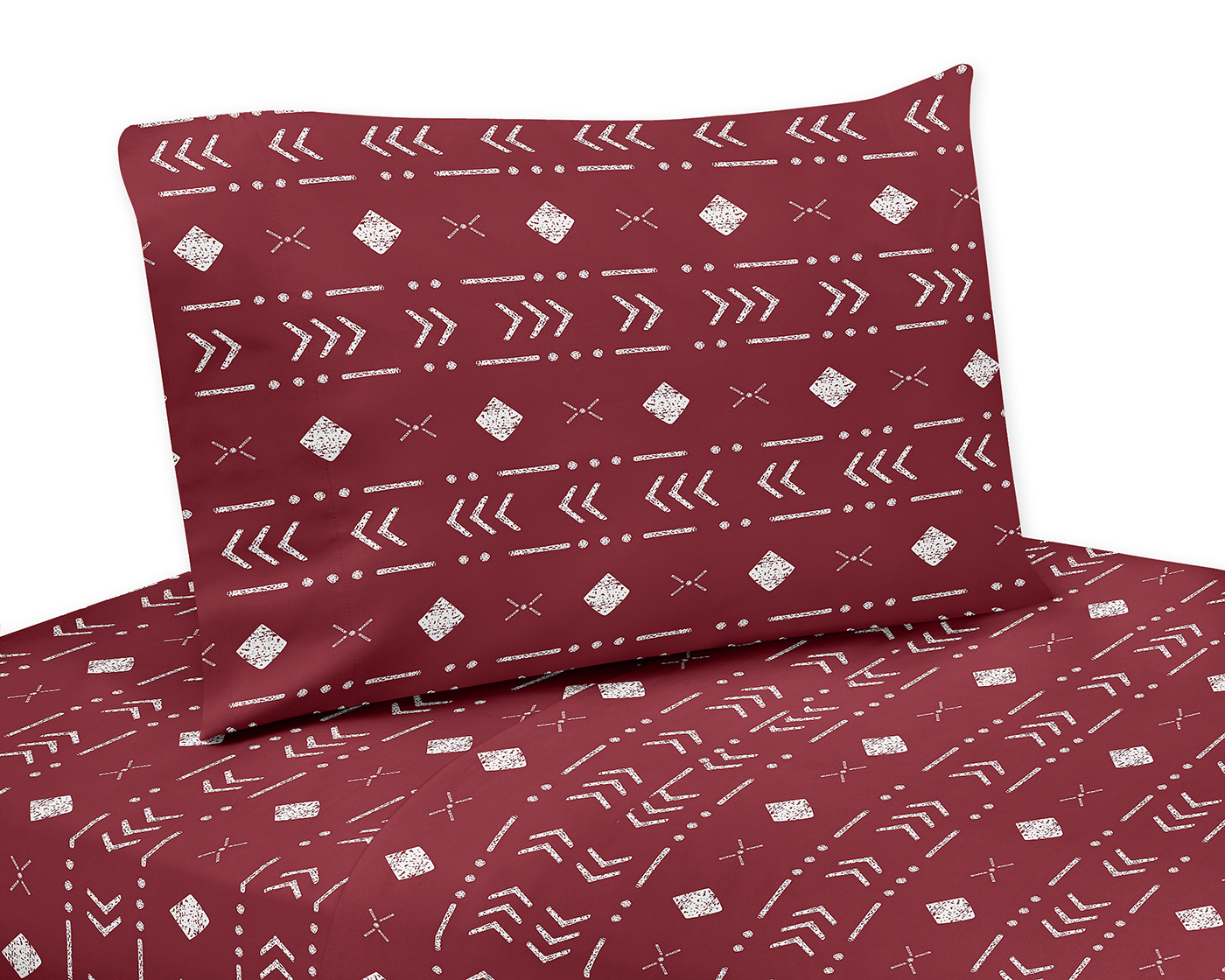 Sweet Jojo Designs Boho Tribal Burgundy Red and White 3pc Twin Sheet set is made to coordinate with their Twin Bedding Sets. These sheets use the red and white tribal mudcloth woodland bohemian southwest geometric arrow aztec mud cloth brushed microfiber fabric. This sheet set is machine washable for easy care.