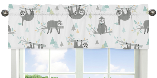 Aqua and Grey Sloth window valances will help complete the look of your Sweet Jojo Designs room. This valance softens the look of the window and obscures pulled up blinds. It will coordinate nicely with your Sweet Jojo Designs bedding or can be used as an accent with your own room design.