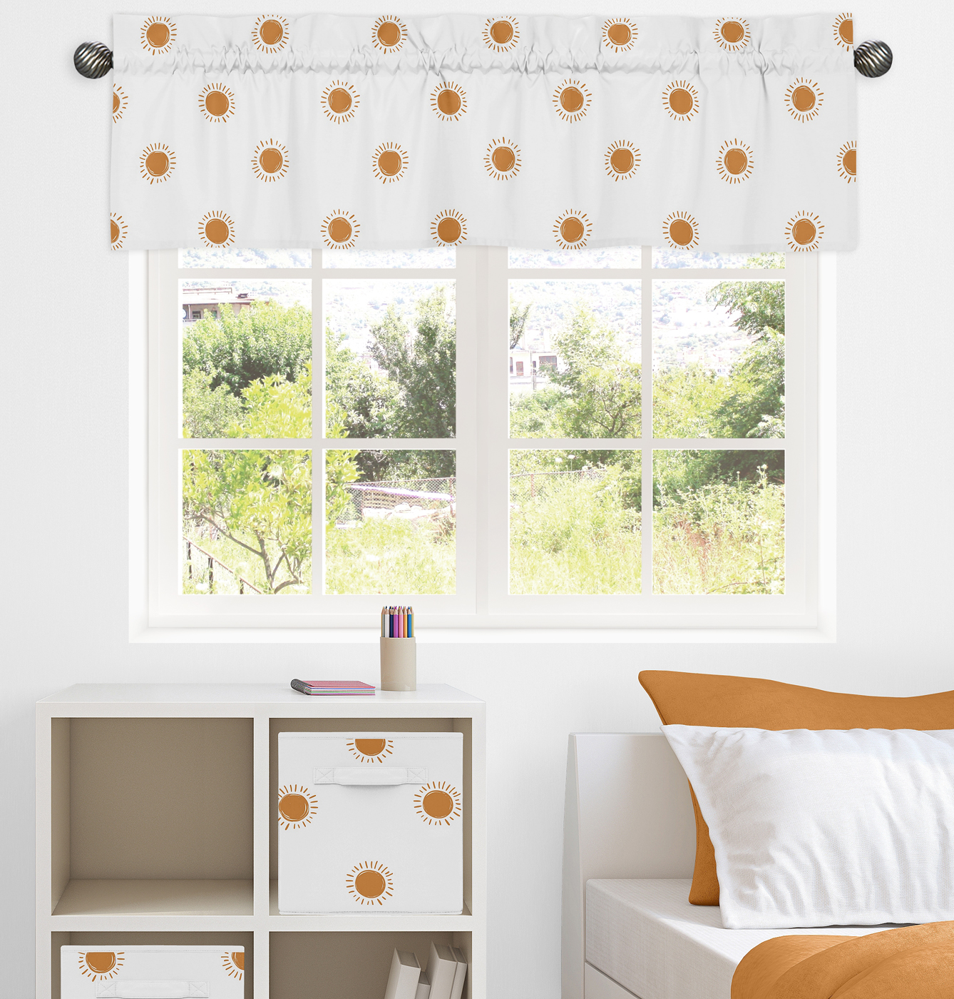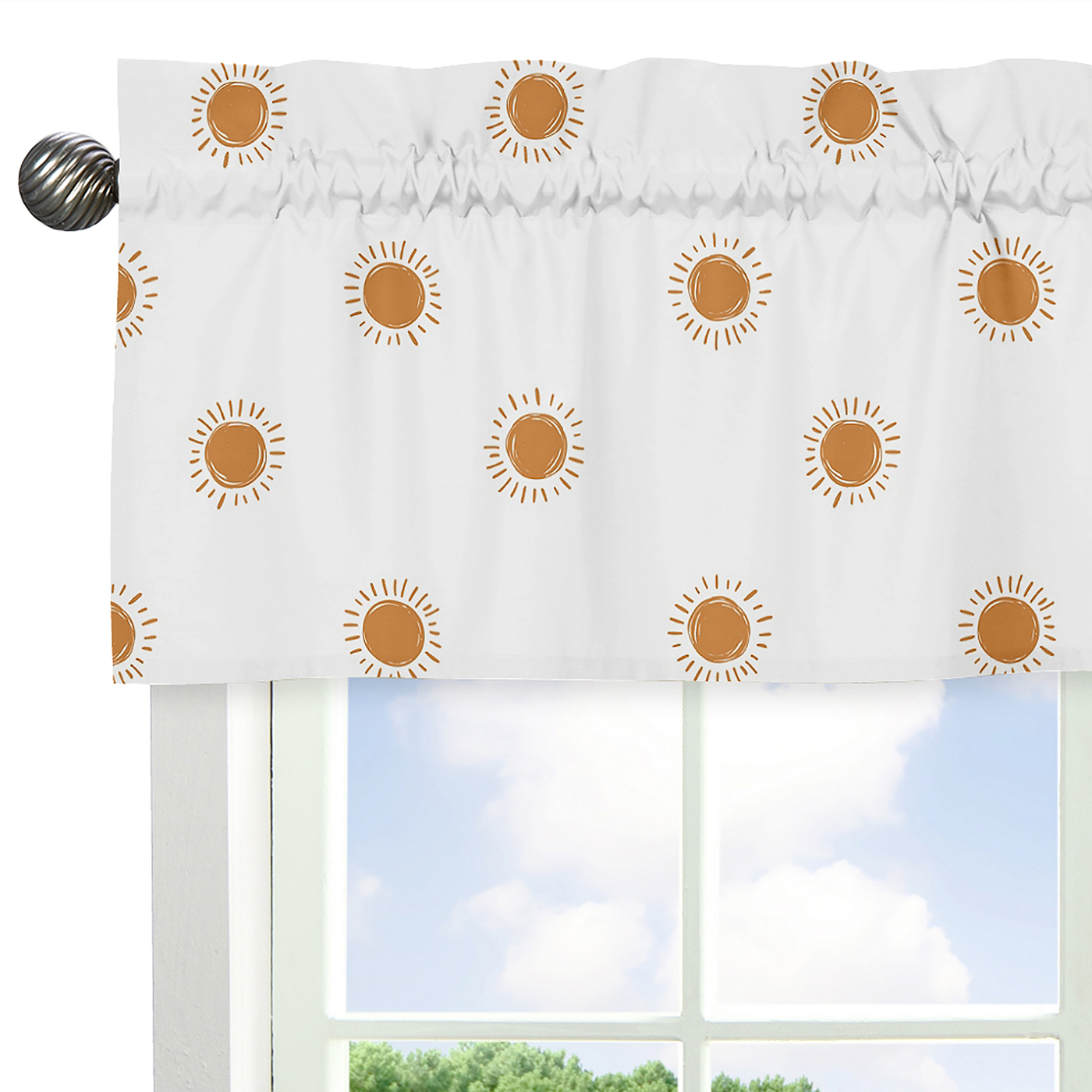 This design has matching accessories such as window treatments, hampers, shower curtains, memory photo boards, body pillow cases and decorative pillowsItem# Valance-Sun-WH-PM-PRT