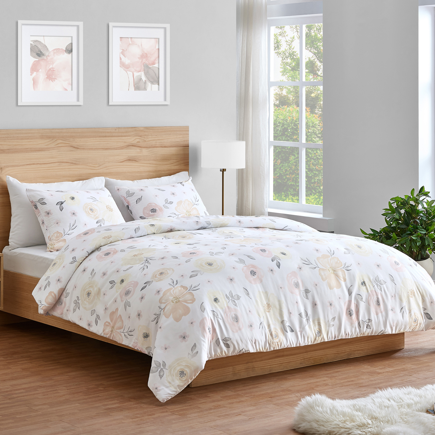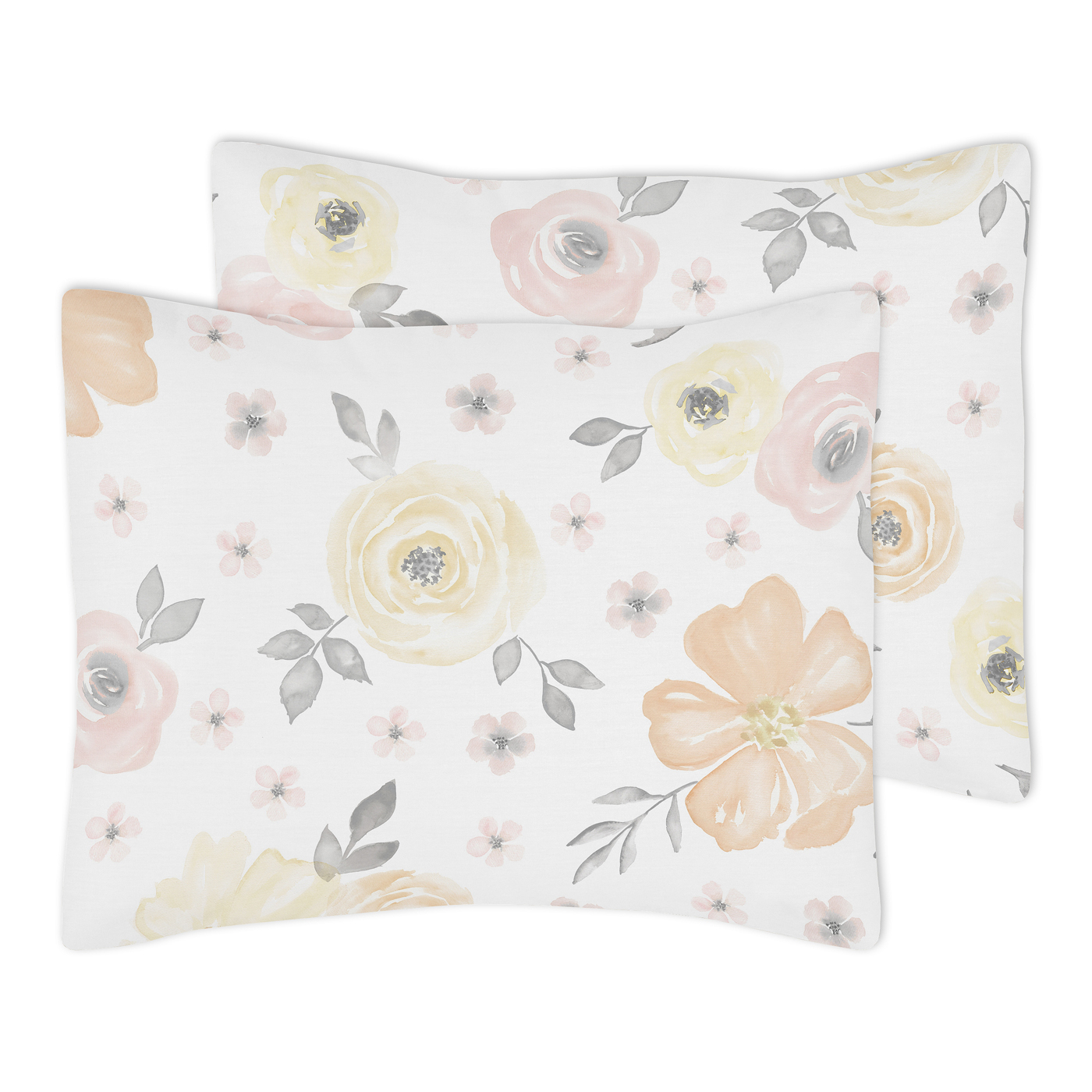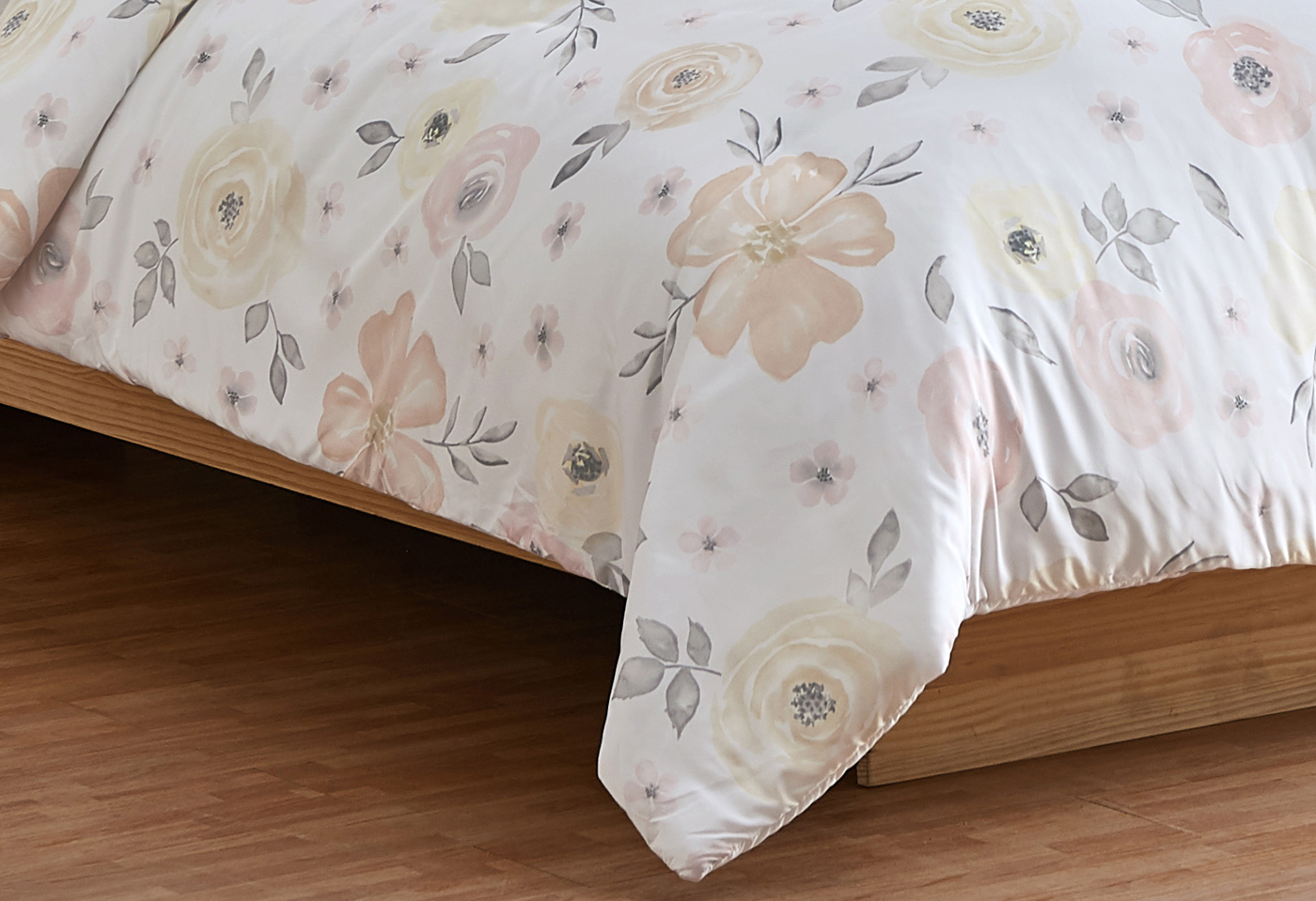 Yellow and Pink Watercolor Floral Full/Queen Bedding set will help you create an incredible room for your child. This stylish designer bedding set features an exclusive brushed microfiber hand painted watercolor floral print. This collection uses the stylish colors of yellow, grey, peach, white, and shades of pink. The design uses brushed microfiber fabrics that are machine washable for easy care. This wonderful set will fit full and queen size beds.