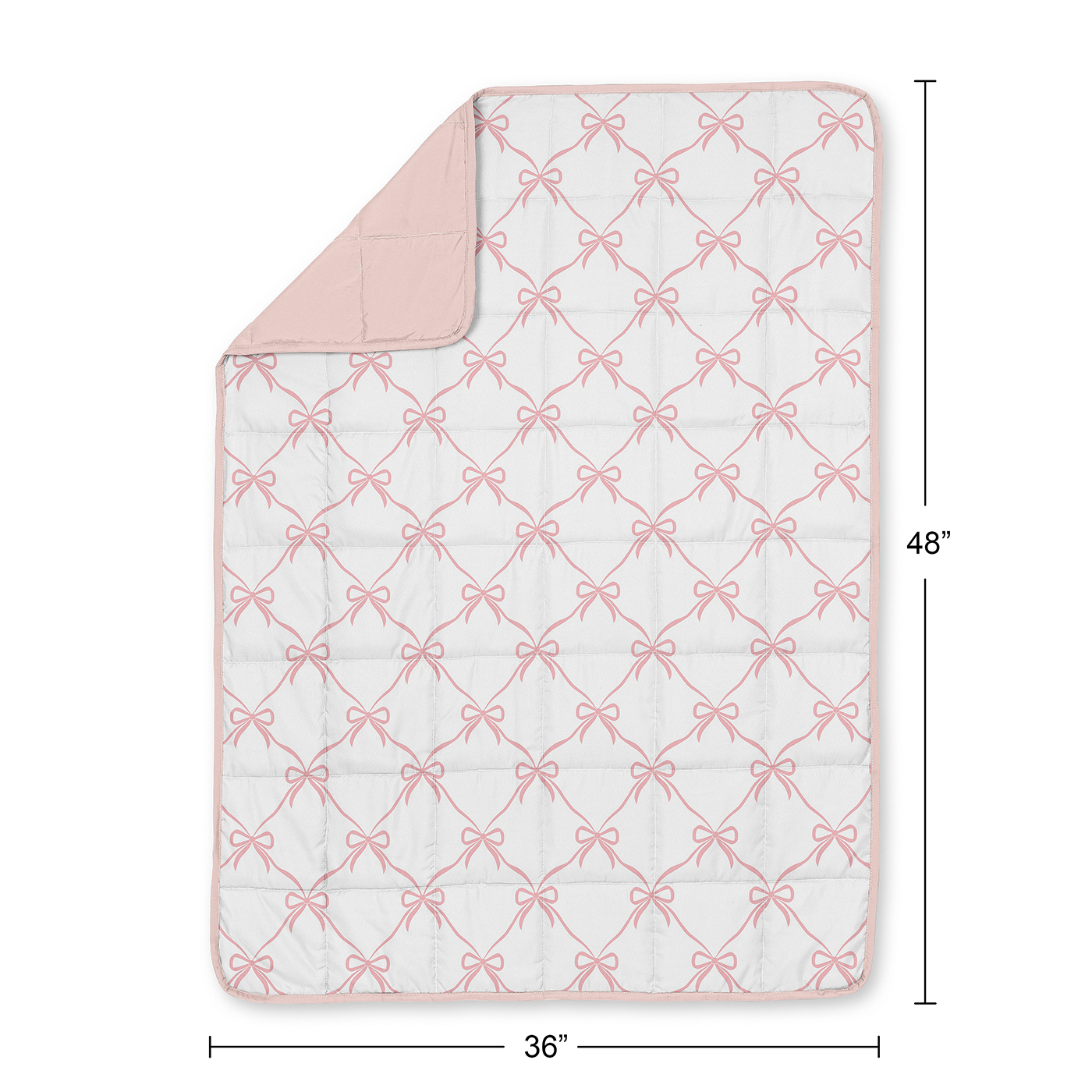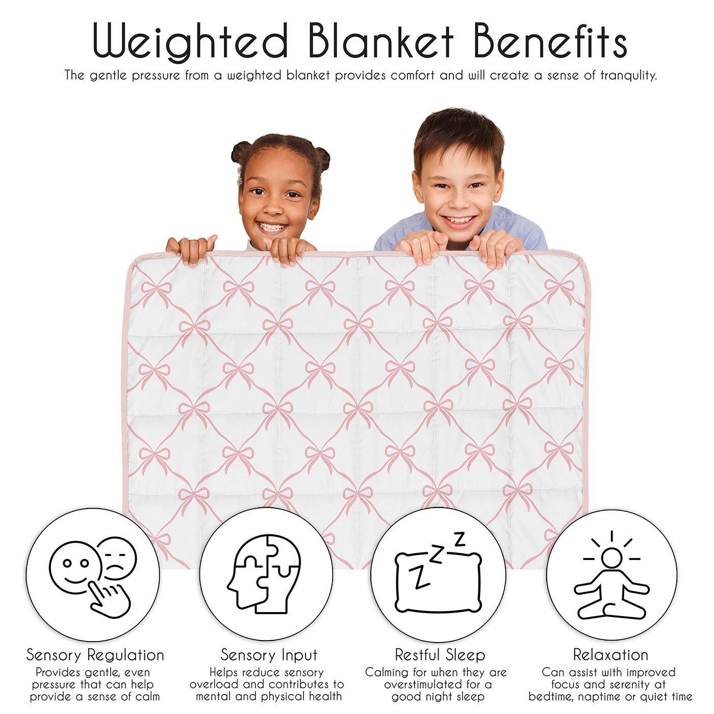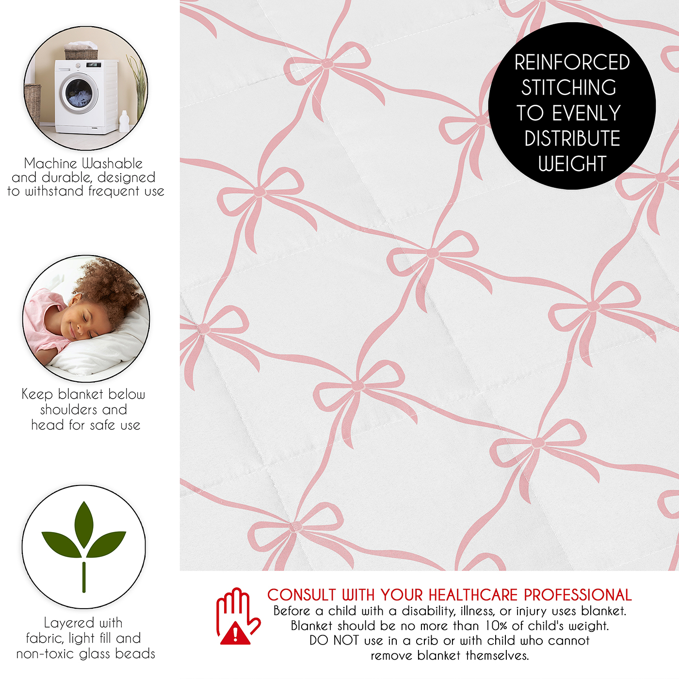 CALM & COZY: (1) 36 in. x 48 in. 5lbs. Features a layered design of light fill & evenly distributed non-toxic glass beads & an outer layer of microfiber fabric designed with a pink & white classic, cottagecore bows print & reverses to a solid blush pink & finished with pink blush trim. PLEASE NOTE: THIS IS HEAVIER THAN A NORMAL BLANKET. Machine wash cold separately on gentle cycle or hand wash. May tumble dry low on delicate. Lay flat to air dry is recommended. DO NOT bleach, iron or dry cleanDESIGNED IN THE USA: By real parents who understand the need for comfort, practicality, and style. Sweet Jojo Designs is a small, women owned business. The mom's on our team know an any season weighted blanket for kids is first priority for your room essentials for a restful night of sleep. We use top fabrics and designs to create soft throw blankets that are breatheable and comfortable for your family. We've studied the latest trends in weighted lap blankets to bring you the finest product.SAFE & DURABLE: We created this weighted throw with a light fill to cushion the weighted glass beads and a quilted grid design with reinforced stitching to help prevent shifting of the beads when in use. Light even pressure can support a restful night for your child for overall better sleep quality, resulting in more productive days. This weighted blanket for kids will become a new essential comfort during restless nightPERFECT GIFT: Add weighted blanket for children to your list of must haves! Including a small weighted blanket to your holiday gift list, in a kids birthday gift basket or as a present. Provide a sanctuary on overwhelming days for your child by simulating the hug of loved ones while sleeping, watching tv, reading, road trips, during playtime, coloring or screen time. For best fit, make sure blanket weight is no more than 10% of the child’s weight so that it isn’t too light or too heavy. BEDROOM DESIGN MADE EASY: Designed to coordinate with Sweet Jojo Designs childrens bedding sets, sheet sets, window treatments, wall decor, and storage solutions, this weighted lap pad is the perfect addition to your kids bedroom makeover. Order as many as you need for nap time, homework hour, bedtime cuddles, sleepovers, traveling, camping, car rides and more. Keep an extra at the office to help get a moment of zen in the middle of the day.Item# WB-5-Ballet-BOW