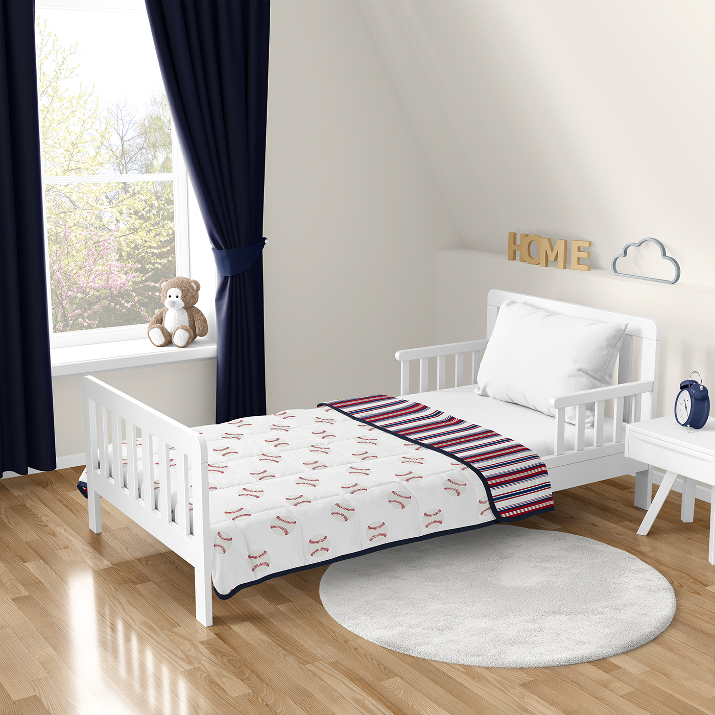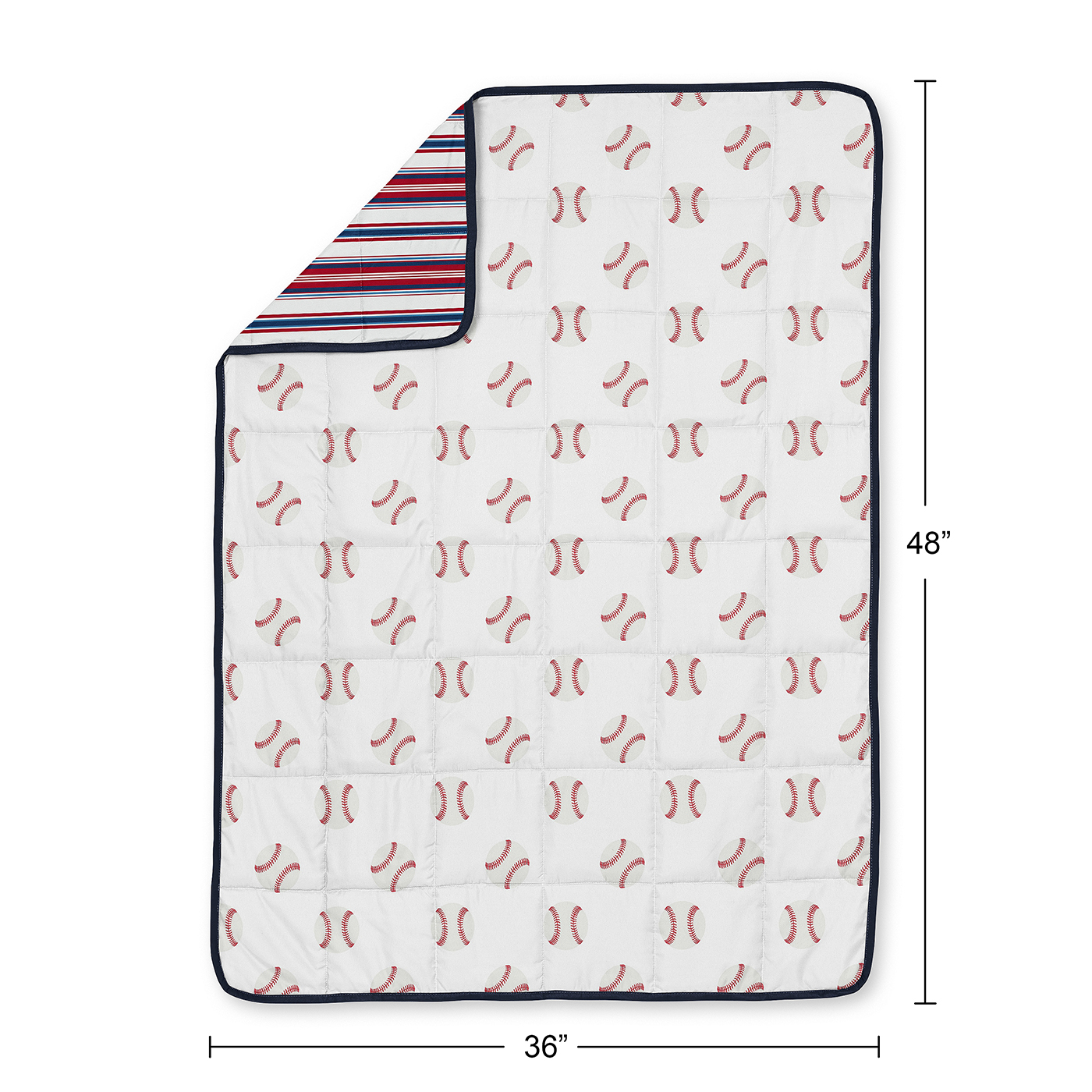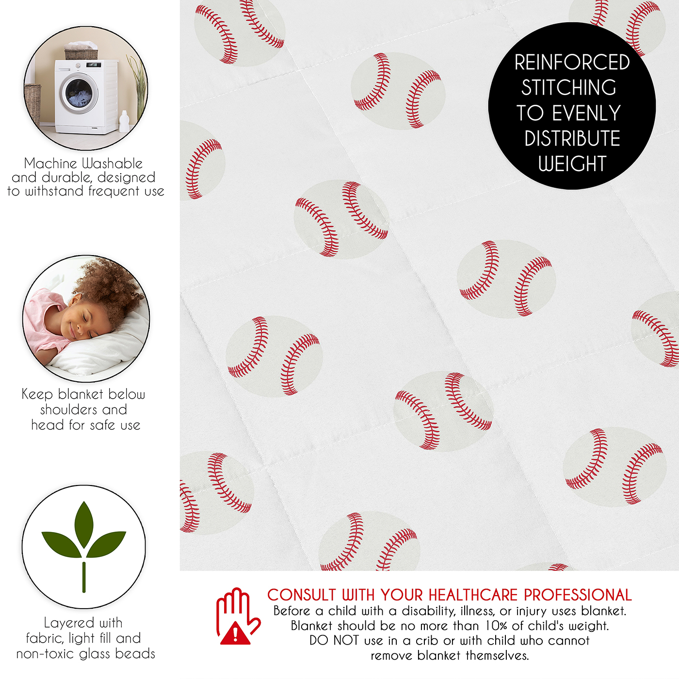 CALM & COZY: (1) 36 in. x 48 in. 5lbs. Features a layered design of light fill & evenly distributed non-toxic glass beads & an outer layer of microfiber fabric designed with a red & white vintage, baseballs print & reverses to a blue, red & white striped print & finished with navy trim. PLEASE NOTE: THIS IS HEAVIER THAN A NORMAL BLANKET. Machine wash cold separately on gentle cycle or hand wash. May tumble dry low on delicate. Lay flat to air dry is recommended. DO NOT bleach, iron or dry cleanDESIGNED IN THE USA: By real parents who understand the need for comfort, practicality, and style. Sweet Jojo Designs is a small, women owned business. The mom's on our team know an any season weighted blanket for kids is first priority for your room essentials for a restful night of sleep. We use top fabrics and designs to create soft throw blankets that are breatheable and comfortable for your family. We've studied the latest trends in weighted lap blankets to bring you the finest product.SAFE & DURABLE: We created this weighted throw with a light fill to cushion the weighted glass beads and a quilted grid design with reinforced stitching to help prevent shifting of the beads when in use. Light even pressure can support a restful night for your child for overall better sleep quality, resulting in more productive days. This weighted blanket for kids will become a new essential comfort during restless nightPERFECT GIFT: Add weighted blanket for children to your list of must haves! Including a small weighted blanket to your holiday gift list, in a kids birthday gift basket or as a present. Provide a sanctuary on overwhelming days for your child by simulating the hug of loved ones while sleeping, watching tv, reading, road trips, during playtime, coloring or screen time. For best fit, make sure blanket weight is no more than 10% of the child’s weight so that it isn’t too light or too heavy. BEDROOM DESIGN MADE EASY: Designed to coordinate with Sweet Jojo Designs childrens bedding sets, sheet sets, window treatments, wall decor, and storage solutions, this weighted lap pad is the perfect addition to your kids bedroom makeover. Order as many as you need for nap time, homework hour, bedtime cuddles, sleepovers, traveling, camping, car rides and more. Keep an extra at the office to help get a moment of zen in the middle of the day.Item# WB-5-BaseballPatch