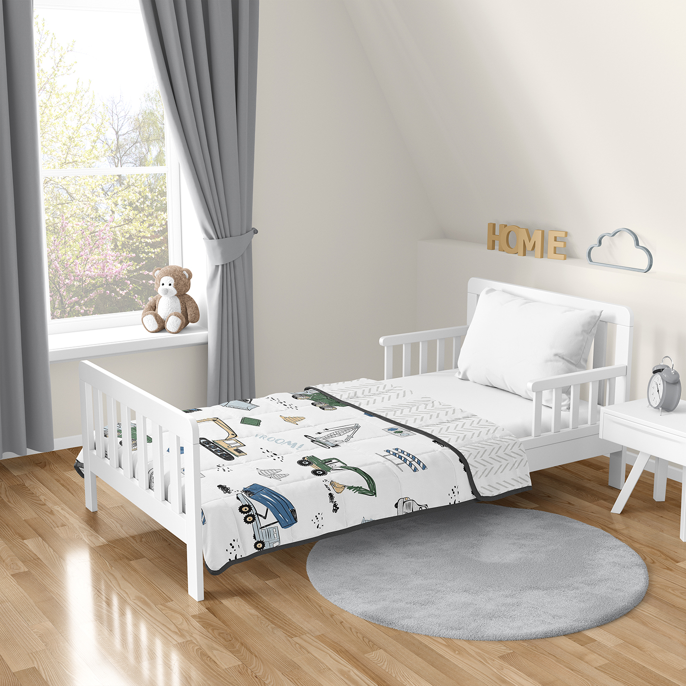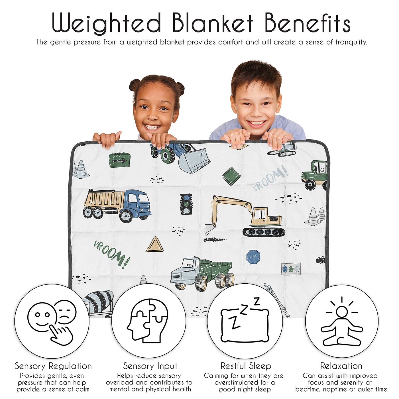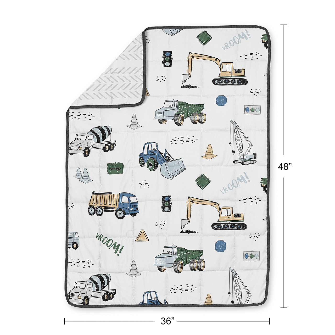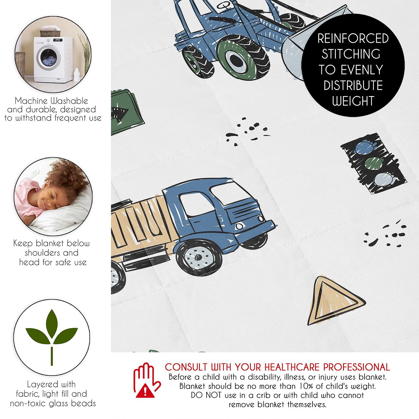 CALM & COZY: (1) 36 in. x 48 in. 5lbs. Features a layered design of light fill & evenly distributed non-toxic glass beads & an outer layer of microfiber fabric designed with a tractor, cement mixer construction print & reverses to a gray tire track print & finished with dark gray trim. PLEASE NOTE: THIS IS HEAVIER THAN A NORMAL BLANKET. Machine wash cold separately on gentle cycle or hand wash. May tumble dry low on delicate. Lay flat to air dry is recommended. DO NOT bleach, iron or dry cleanDESIGNED IN THE USA: By real parents who understand the need for comfort, practicality, and style. Sweet Jojo Designs is a small, women owned business. The mom's on our team know an any season weighted blanket for kids is first priority for your room essentials for a restful night of sleep. We use top fabrics and designs to create soft throw blankets that are breatheable and comfortable for your family. We've studied the latest trends in weighted lap blankets to bring you the finest product.SAFE & DURABLE: We created this weighted throw with a light fill to cushion the weighted glass beads and a quilted grid design with reinforced stitching to help prevent shifting of the beads when in use. Light even pressure can support a restful night for your child for overall better sleep quality, resulting in more productive days. This weighted blanket for kids will become a new essential comfort during restless nightPERFECT GIFT: Add weighted blanket for children to your list of must haves! Including a small weighted blanket to your holiday gift list, in a kids birthday gift basket or as a present. Provide a sanctuary on overwhelming days for your child by simulating the hug of loved ones while sleeping, watching tv, reading, road trips, during playtime, coloring or screen time. For best fit, make sure blanket weight is no more than 10% of the child’s weight so that it isn’t too light or too heavy. BEDROOM DESIGN MADE EASY: Designed to coordinate with Sweet Jojo Designs childrens bedding sets, sheet sets, window treatments, wall decor, and storage solutions, this weighted lap pad is the perfect addition to your kids bedroom makeover. Order as many as you need for nap time, homework hour, bedtime cuddles, sleepovers, traveling, camping, car rides and more. Keep an extra at the office to help get a moment of zen in the middle of the day.Item# WB-5-Construction-GR-BU