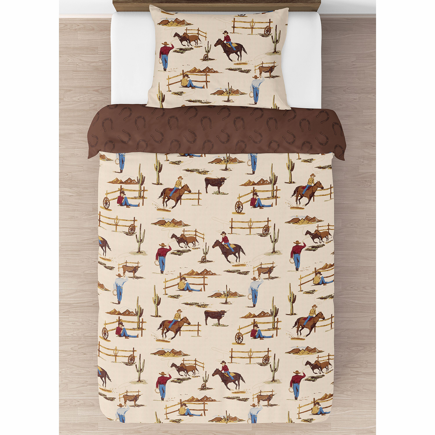 2PC TWIN BEDDING SETS FOR BOYS INCLUDES: Lightweight Comforter (62in. x 86in.) & Standard Sham (20in. x 26in.). Easy machine washable and dryable on low. This southern charm twin comforter set for boys is made with super soft, moisture wicking brushed microfiber fabric and features neutral color palette of beige, ivory, cream, taupe, tan, red, denim blue, golden yellow and earthy shades of chocolate brown to bring together this charming, southwestern & wild animal country themed look. WILD WEST COW BOY THEME: This twin boys bedding set boasts a soft blanket & pillow case sham. The bed comforter features western cowboys, horses, cattle & cactus in a desert landscape & reverses to a horseshoe print. This twin bed set has a matching pillow sham with the same horse print that effortlessly makes them a standout addition to any kids bedroom decor. If you're looking for a rustic country western aesthetic for your kids room makeover, this bed comforter set is the perfect focal point.DESIGNED IN THE USA: By real parents who understand the need for comfort, practicality, and style. Sweet Jojo Designs is a small, women owned business. The mom's on our team know a twin size comforter sets is first priority to ensure a restful night of sleep. Crafted with premium materials to create a soft single bed comforter that pairs easily with room decor and is comfortable for your little one. We've studied the latest trends in bed in a bag twin to bring you the finest product.MATCHING DECOR & ACCESORIES: Purchasing a boys twin bedding set from Sweet Jojo Designs offers a many benefits. If you have a room to decorate, we have endless options to help. An interior design theme can be planned around a bedding comforter set, creating a cohesive space without mixing & matching. Sweet Jojo Designs adds a personalized touch to your space with a wide variety of coordinating room decor such as window treatments, wall decor, sheet sets, shower curtains, memo boards and more.PERFECT GIFT: Twin bed sets for boys that include bedding comforters and sham offers convenience and savings and should be #1 on your bedroom makeover essentials or den room necessities list! Twin bed comforter sets make a unique & thoughtful birthday gift, Christmas presents, holiday treat, sleepover care package, or Easter basket stuffers for kids or teens. This practical gift idea provides comfort and warmth through the all seasons comforter & pillow protection through the pillowcase sham. Item# WildWest-PRT-Twin-4