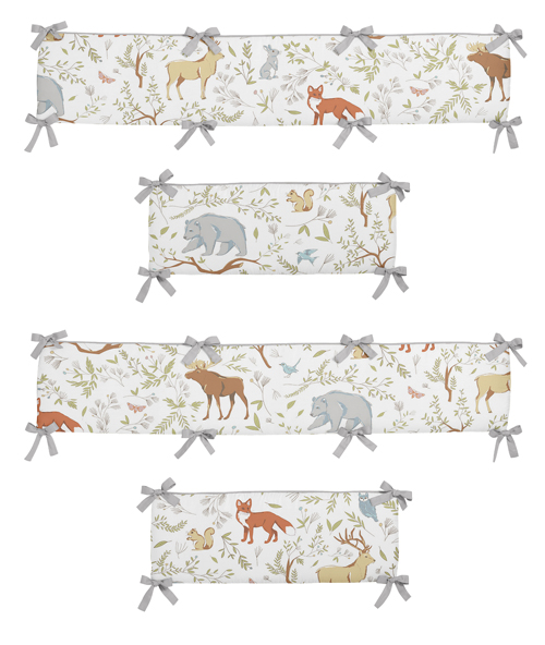 Now you can complete your nursery decor with this Sweet Jojo Designs Woodland Toile crib bumper. This bumper is created using the woodland animal toile print and reverses to the blue lattice print. The bumper is finished with grey piping and upper and lower ties. The appealing color palette of white, grey, blue, green and earth tones will set your nursery up in high style.