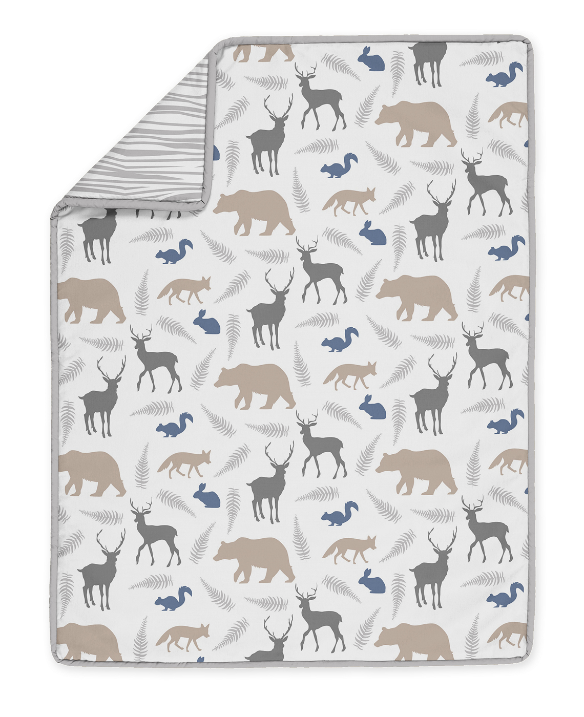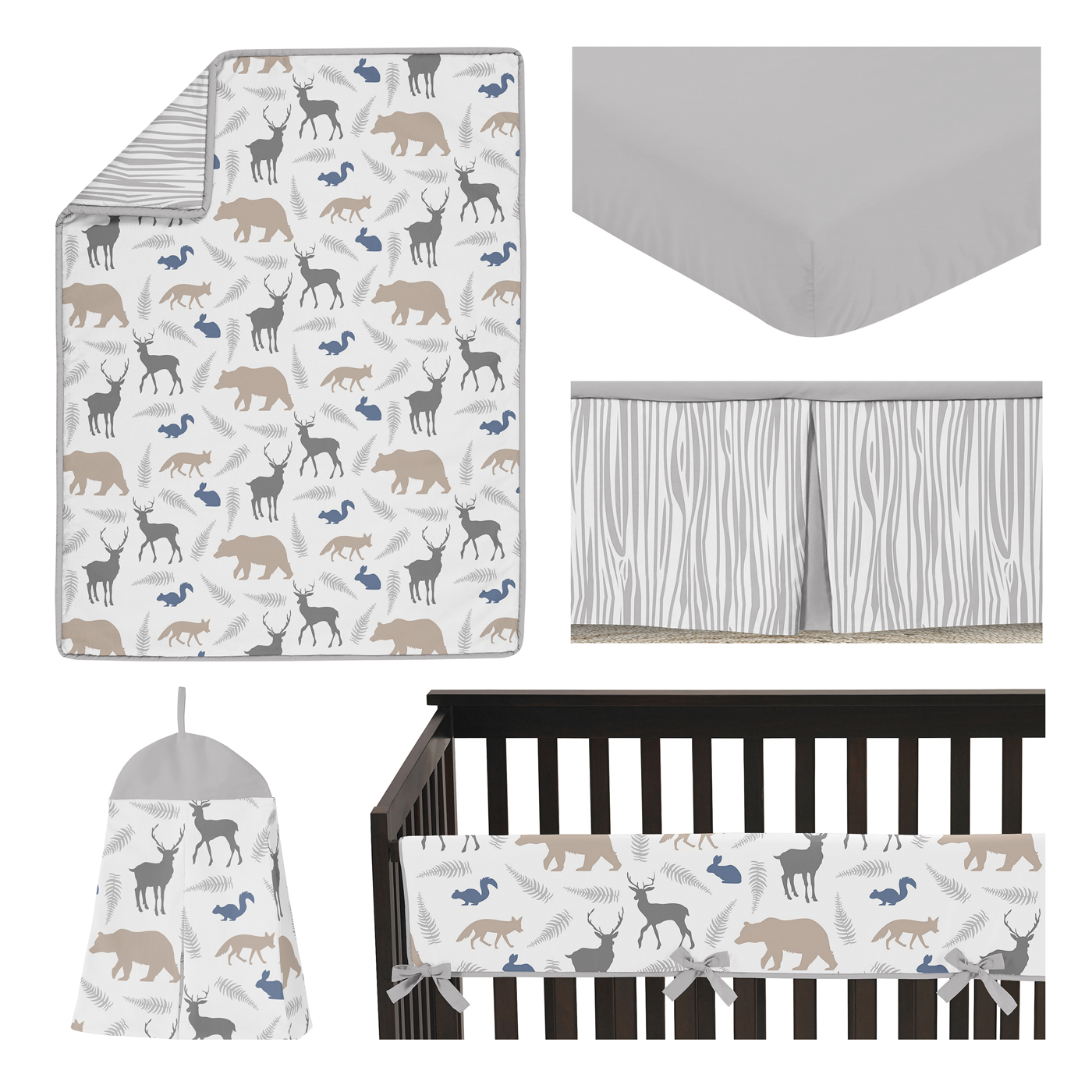 Woodland Animals 5 pc Crib Bedding set has all that your little bundle of joy will need. Let the little one in your home settle down to sleep in this incredible nursery set. This baby boy bedding set features a woodland forest animal print, a coordinating wood grain print, and solid grey. This collection uses the stylish colors of grey, white, blue and taupe. The design uses brushed microfiber fabrics that are machine washable for easy care. This wonderful set will fit most standard cribs and toddler beds.