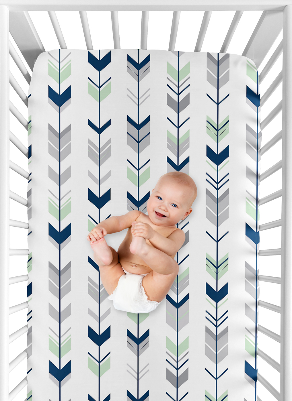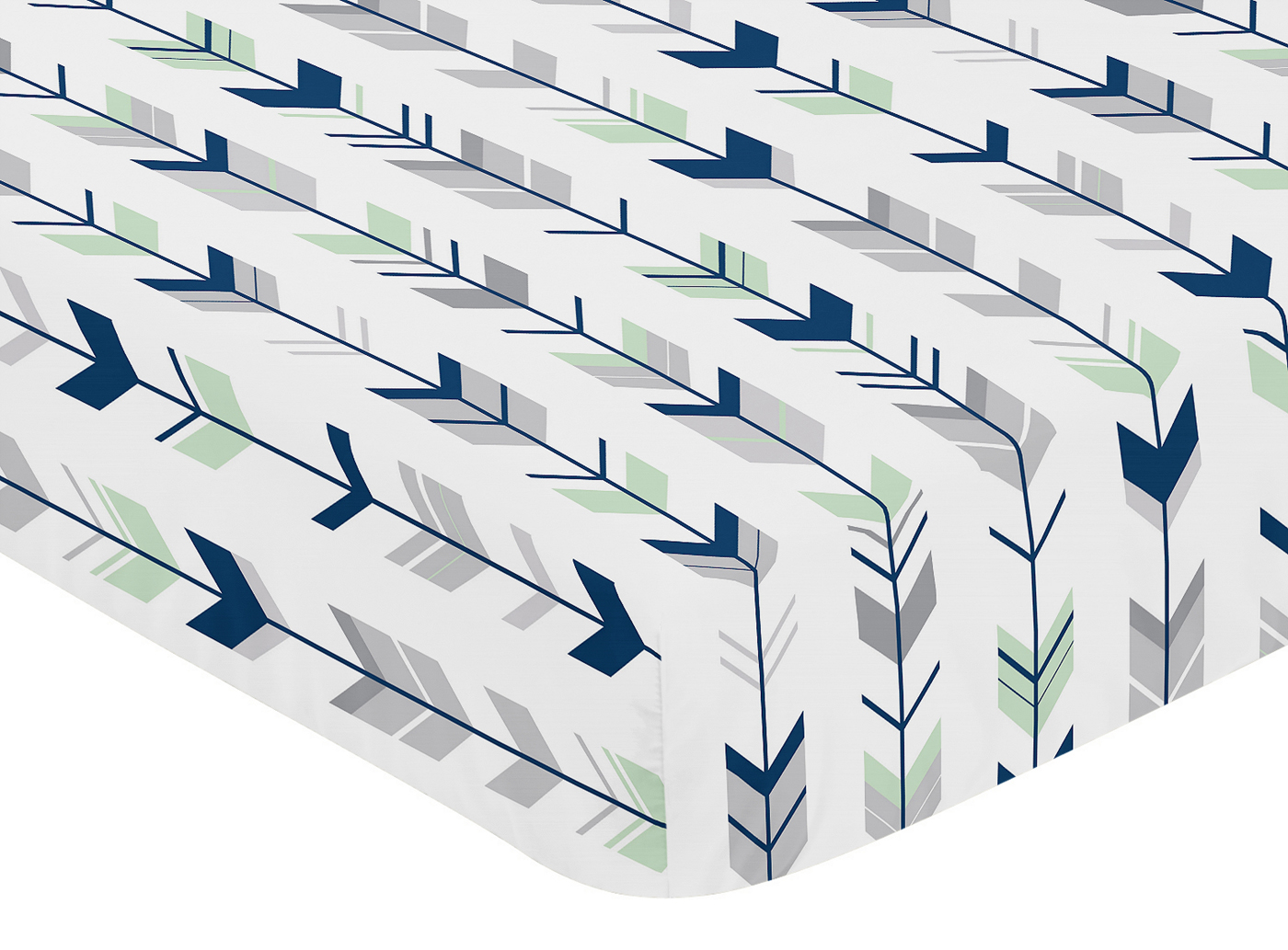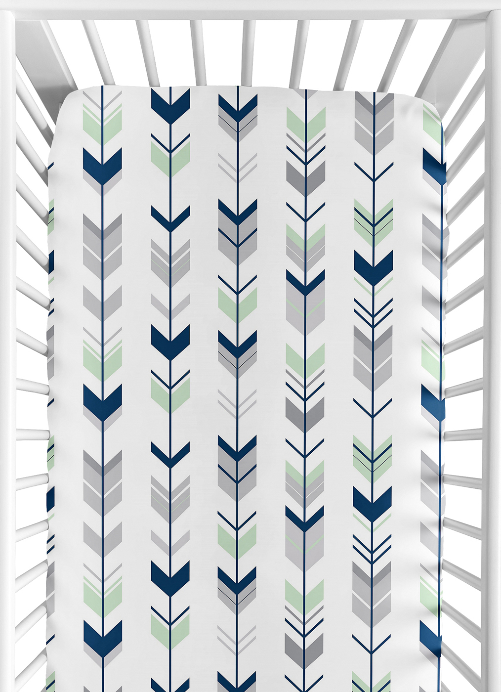 Navy and Mint Woodsy fitted crib sheets will help complete the look of your Sweet Jojo Designs nursery. This arrow print brushed microfiber sheet fits all standard crib and toddler mattresses and is machine washable for easy care. Dimensions: 52 in x 28 in x 8 in.